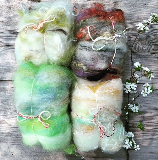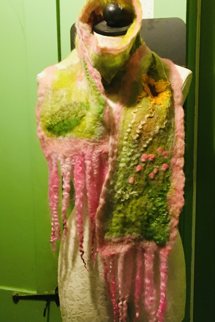 Materials fee: $45.00 (to be paid to instructor) payable to instructor on the day of class, includes bubble wrap, netting, a felting stone, a foam block w/ 2 felting needles. You choose your palette with hand dyed merino, natural Border Leicester, cashmere, Masham long wool curls and silk chiffon fabric