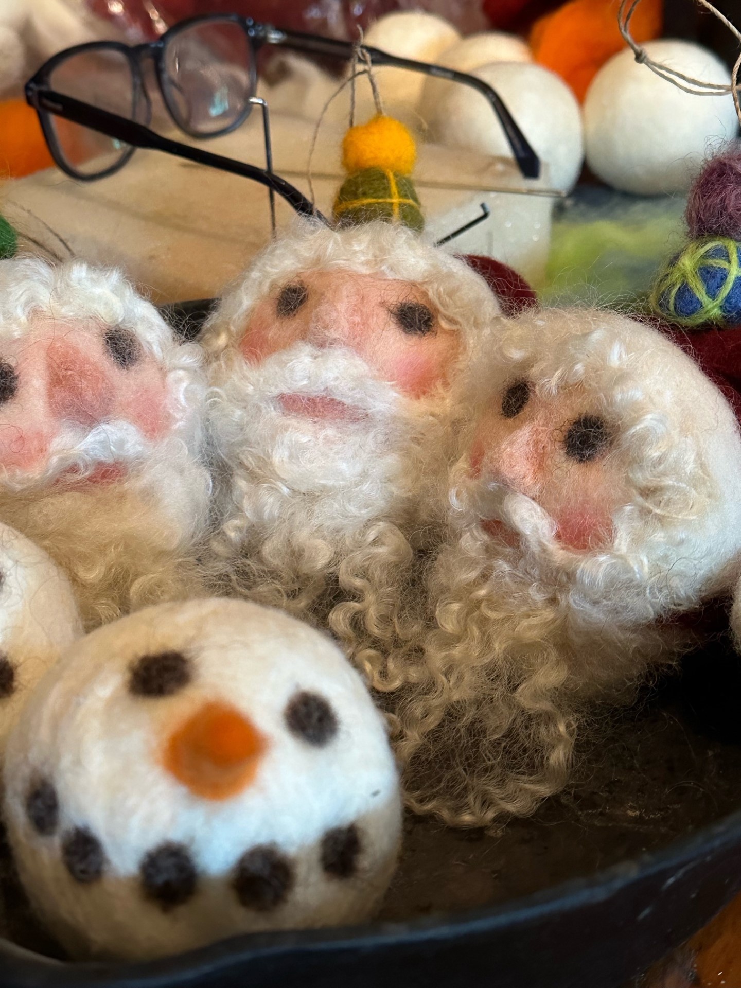 Needle Felted Ornaments Instructor: Betsey Leslie Think Christmas and beyond! Fun for all levels from beginner to advanced felters. We will be creating 3 hanging ornaments and a self standing figure combining wet and needle felting techniques. First we will wet felt the styrofoam balls with wool and then use felting needles in different sizes to sculpt wool onto the base for these great 3D ornaments.Including Santa, snowmen or snow women and the knowledge to make an original design.All of the wool is hand dyed specially for this class and everything you need for materials is provided. Skill level: All Enrollment:10 Workshop Fee: $45 Material Fee: $40 (paid to instructor) This includes felting needles (3 diff sizes),foam pad, glass cheese shaker, twine , roving and white curls for Santa. Extra materials will be available for purchase so you can continue more ornaments at your leisure Time: Friday am Half day class ~~~~~~~~~~~~~~~~~~~~~~~~~~~~~~~~~~~~~~~~~~~~~~~~~~~~~~~~~~~~~~~~~~~~~~ |