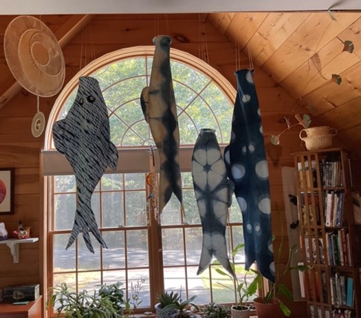 Sekka / Fish Wind Sock - Instructor: Kathleen Goddu Create a traditional Japanese fish wind sock. We will begin by creating the fabric using the Sekka shibori technique. You will be amazed by the simplicity of this technique and the mesmerizing, illuminating patterns it reveals. Use this beautiful fabric to create a traditional Japanese fish wind sock to hang inside or outside of your home/camp. When the windsock is finished it will be on a swivel so that it will spin in the wind!! Skill level: all Enrollment: min. 5 max 10 Workshop fee: $55.00 Material Fee: $15 (to be paid to instructor) Materials provided: Fabric, fish pattern, dye (indigo), a swivel, fishing line, and a 2" ring. At least one sewing machine, surgical gloves, irons, ironing boards, and an extractor. Supplies to Bring to class: Fabric scissors, straight pins, needle and thread (white or black), and an apron. Time: Friday - All day class ~~~~~~~~~~~~~~~~~~~~~~~~~~~~~~~~~~~~~~~~~~~~~~~~~~~~~~~~~~~~ |
