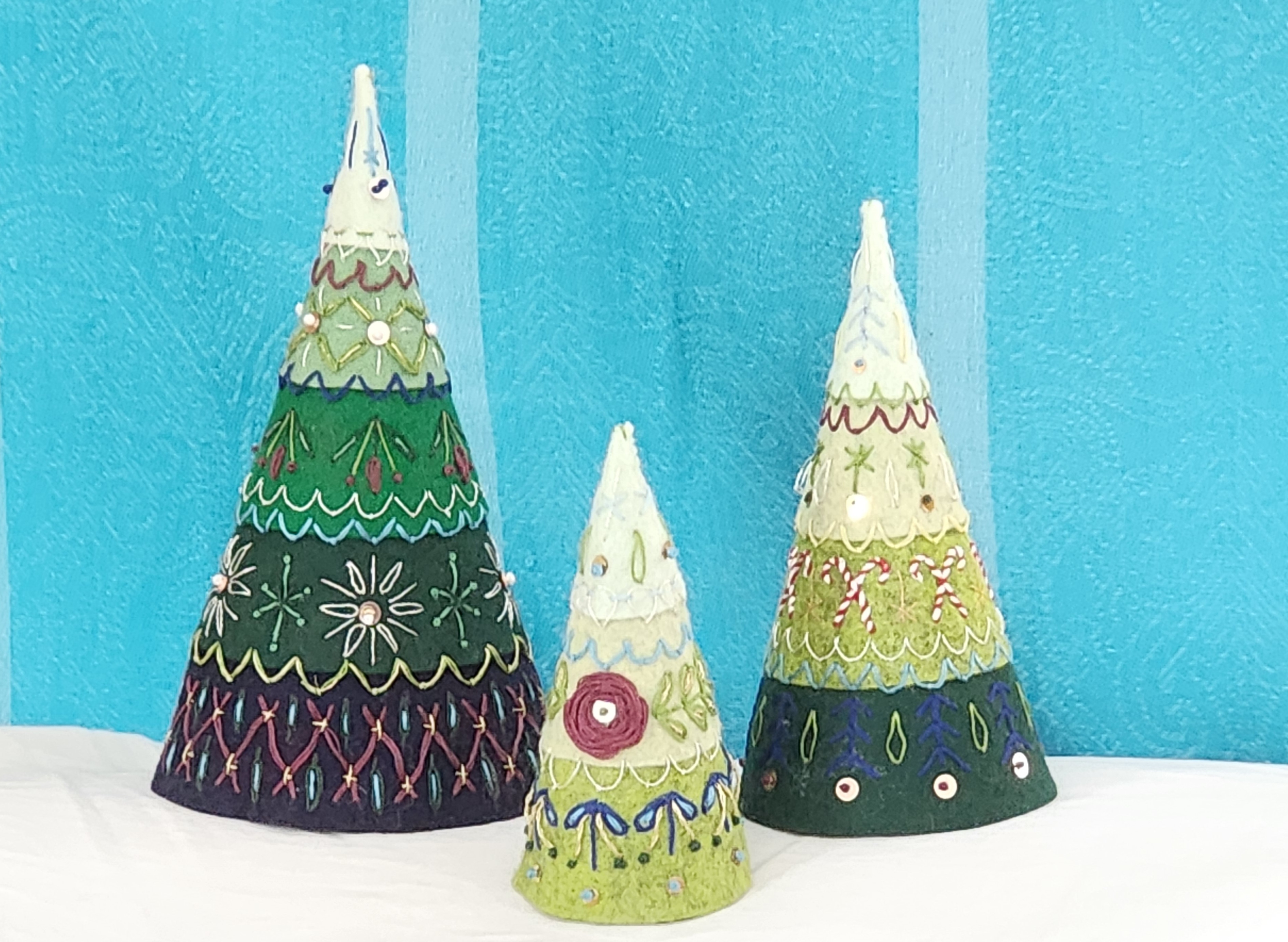 Fanciful Embroidered Trees Instructor: Linda Whiting Using a few simple stitches and some fancy threads on felt, create some decorative trees to display or give as gifts when Christmas comes in December. Working first on paper we will use our imaginations to create a delightful set of trees. If you already know embroidery stitches you will have a head start, but stitches will be explained so even if you have not done any embroidery you will learn enough simple stitches to make lovely trees. Once your layered trees are stitched while flat you will wrap them over a cone to stitch them to stand alone. Trees can be stacked when put away after Christmas. Beads and sequins can be added to make them sparkle. Skill level: open to all Enrollment: 10 Workshop fee: $85.00 Materials Fee: $15 (paid to instructer) colored felt, paper for design layout, stitch diagrams, sequins, beads, embroidery floss and some fancy threads, embroidery needles and threaders, cones to wrap your trees over, stitch diagrams Materials student should bring to class: Time: Sunday - All Day Class ~~~~~~~~~~~~~~~~~~~~~~~~~~~~~~~~~~~~~~~~~~~~~~~~~~~~~~~~~~~~~ |