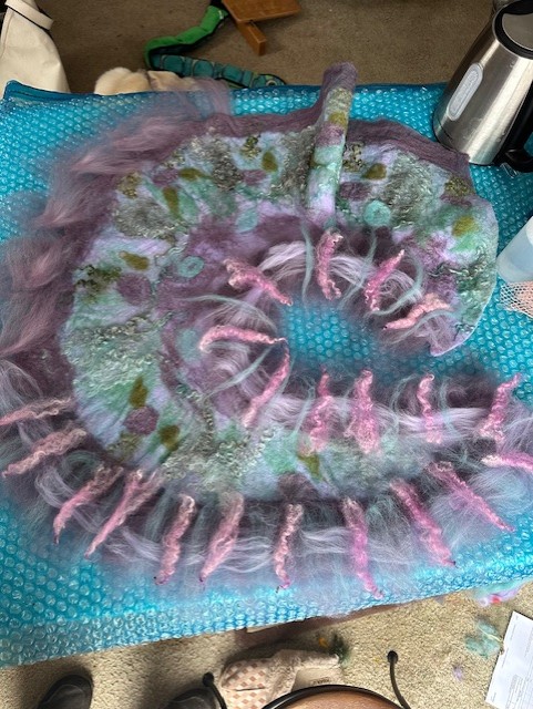 Materials fee: $45.00 (to be paid to instructor) payable to instructor on the day of class, includes bubble wrap, netting, a felting stone, a foam block w/ 2 felting needles. You choose your palette with hand dyed merino, natural Border Leicester, cashmere, Masham long wool curls and silk chiffon fabric
